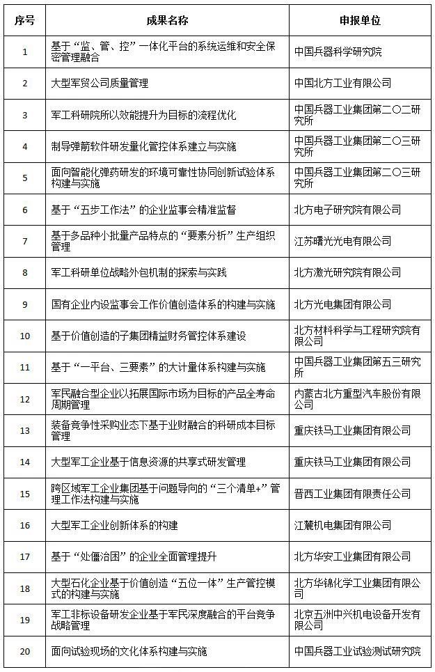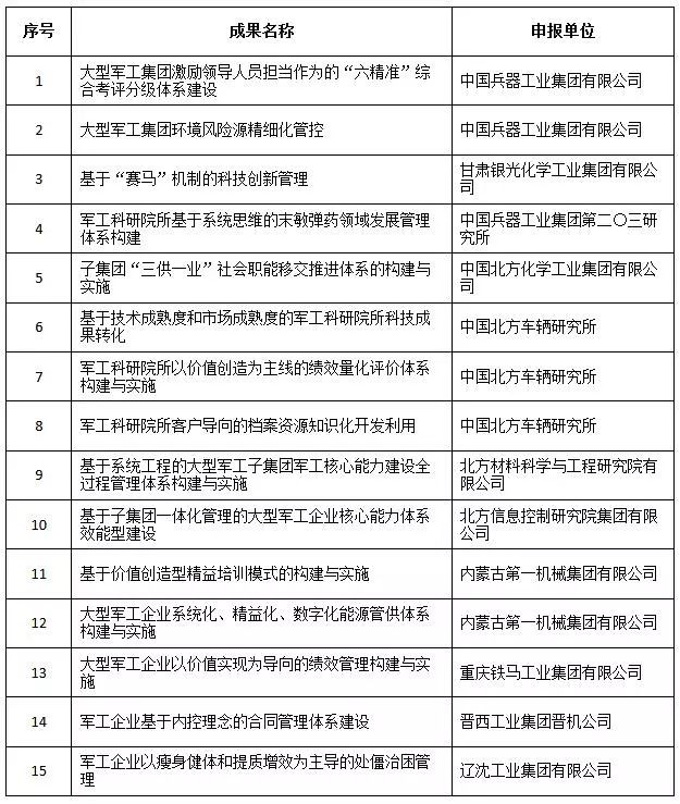 近日,中國兵器工業(yè)集團4項創(chuàng)新成果獲全國企業(yè)管理現(xiàn)代化創(chuàng)新成果獎、42項創(chuàng)新成果獲國防科技工業(yè)企業(yè)管理創(chuàng)新成果獎。 全國企業(yè)管理現(xiàn)代化創(chuàng)新成果 經(jīng)全國企業(yè)管理現(xiàn)代化創(chuàng)新成果審定委員會終審,第二十五屆全國企業(yè)管理現(xiàn)代化創(chuàng)新成果公布,中國兵器工業(yè)集團4項創(chuàng)新成果榮獲二等獎。 二等獎 國防科技工業(yè)企業(yè)管理創(chuàng)新成果 2018年度國防科技工業(yè)企業(yè)管理創(chuàng)新獲獎成果名單發(fā)布,中國兵器工業(yè)集團共獲獎42項,其中:一等獎7項,二等獎15項,三等獎20項。獲獎總量及一等獎數(shù)量均位于軍工集團首位。 一等獎 二等獎 三等獎 據(jù)悉,2018年度的國防科技工業(yè)企業(yè)管理創(chuàng)新評審工作,經(jīng)專家初審、函審、一等獎候選成果答辯、專家會議評審、評審委員會審核并公示后,評選出一批在履行強軍首責、全面貫徹創(chuàng)新驅(qū)動發(fā)展戰(zhàn)略和全面深化改革、高質(zhì)量發(fā)展等方面的優(yōu)秀成果。本年度共確定獲獎成果307項,其中一等獎44項,二等獎126項,三等獎137項。 |