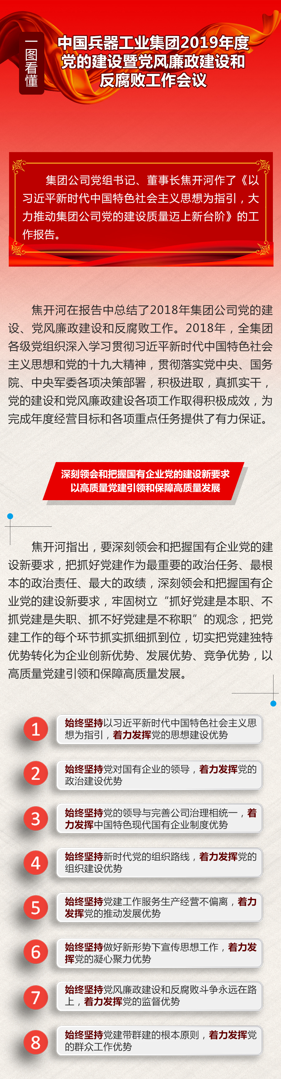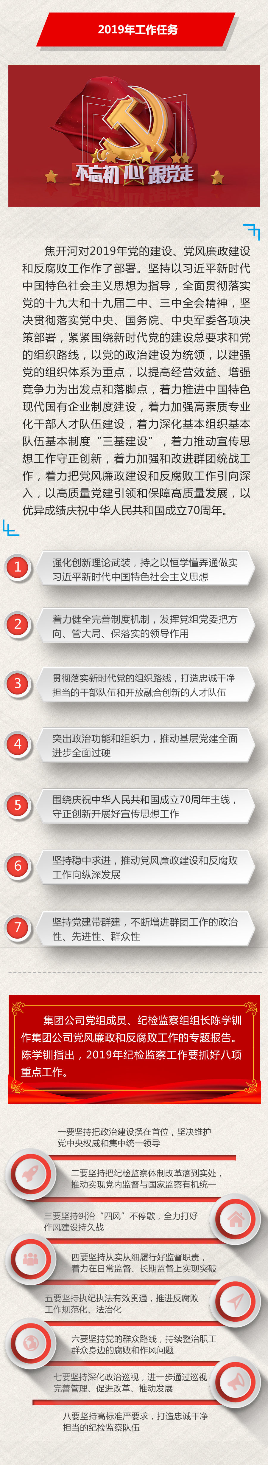 焦開河對2019年黨的建設(shè)、黨風(fēng)廉政建設(shè)和反腐敗工作作了部署。2019年集團(tuán)公司黨建工作總的要求是:以習(xí)近平新時代中國特色社會主義思想為指導(dǎo),全面貫徹落實(shí)黨的十九大和十九屆二中、三中全會精神,堅(jiān)決貫徹落實(shí)黨中央、國務(wù)院、中央軍委各項(xiàng)決策部署,緊緊圍繞新時代黨的建設(shè)總要求和黨的組織路線,以黨的政治建設(shè)為統(tǒng)領(lǐng),以建強(qiáng)黨的組織體系為重點(diǎn),以提高經(jīng)營效益、增強(qiáng)競爭力為出發(fā)點(diǎn)和落腳點(diǎn),著力推進(jìn)中國特色現(xiàn)代國有企業(yè)制度建設(shè),著力加強(qiáng)高素質(zhì)專業(yè)化干部人才隊(duì)伍建設(shè),著力深化基本組織基本隊(duì)伍基本制度“三基建設(shè)”,著力推動宣傳思想工作守正創(chuàng)新,著力加強(qiáng)和改進(jìn)群團(tuán)統(tǒng)戰(zhàn)工作,著力把黨風(fēng)廉政建設(shè)和反腐敗工作引向深入,以高質(zhì)量黨建引領(lǐng)和保障高質(zhì)量發(fā)展,以優(yōu)異成績向新中國成立70周年獻(xiàn)禮。一是強(qiáng)化創(chuàng)新理論武裝,持之以恒學(xué)懂弄通做實(shí)習(xí)近平新時代中國特色社會主義思想。二是著力健全完善制度機(jī)制,發(fā)揮黨組(黨委)把方向、管大局、保落實(shí)的領(lǐng)導(dǎo)作用。三是貫徹落實(shí)新時代黨的組織路線,打造忠誠干凈擔(dān)當(dāng)?shù)母刹筷?duì)伍和開放融合創(chuàng)新的人才隊(duì)伍。四是突出政治功能和組織力,推動基層黨建全面進(jìn)步全面過硬。五是圍繞慶祝新中國成立70周年主線,守正創(chuàng)新開展好宣傳思想工作。六是堅(jiān)持穩(wěn)中求進(jìn),推動黨風(fēng)廉政建設(shè)和反腐敗工作向縱深發(fā)展。七是堅(jiān)持黨建帶群建,不斷增進(jìn)群團(tuán)工作的政治性、先進(jìn)性、群眾性。