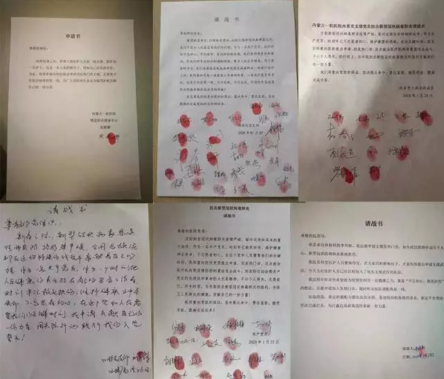 之后,一張張按著紅手印的請戰(zhàn)書紛紛發(fā)到內(nèi)蒙古一機醫(yī)院先鋒黨員群,有的以個人名義請戰(zhàn),有的以支部名義請戰(zhàn)。截至當(dāng)晚7點半,全院151名醫(yī)務(wù)人員主動報名加入“醫(yī)護救援隊”。