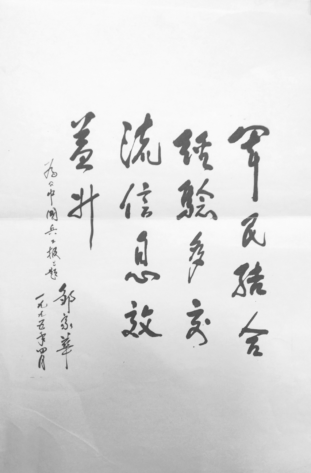 1994年11月14日,原兵器工業(yè)總公司總經(jīng)理張俊九致函時(shí)任中共中央政治局委員、國(guó)務(wù)院副總理鄒家華,懇請(qǐng)他為《中國(guó)兵工報(bào)》題寫報(bào)紙名稱。鄒家華對(duì)兵器工業(yè)格外關(guān)心,第一次為軍工行業(yè)即將創(chuàng)刊的報(bào)紙題寫報(bào)名(見報(bào)紙刊頭)并題詞:軍民結(jié)合經(jīng)驗(yàn)多,交流信息效益升(見下圖)。