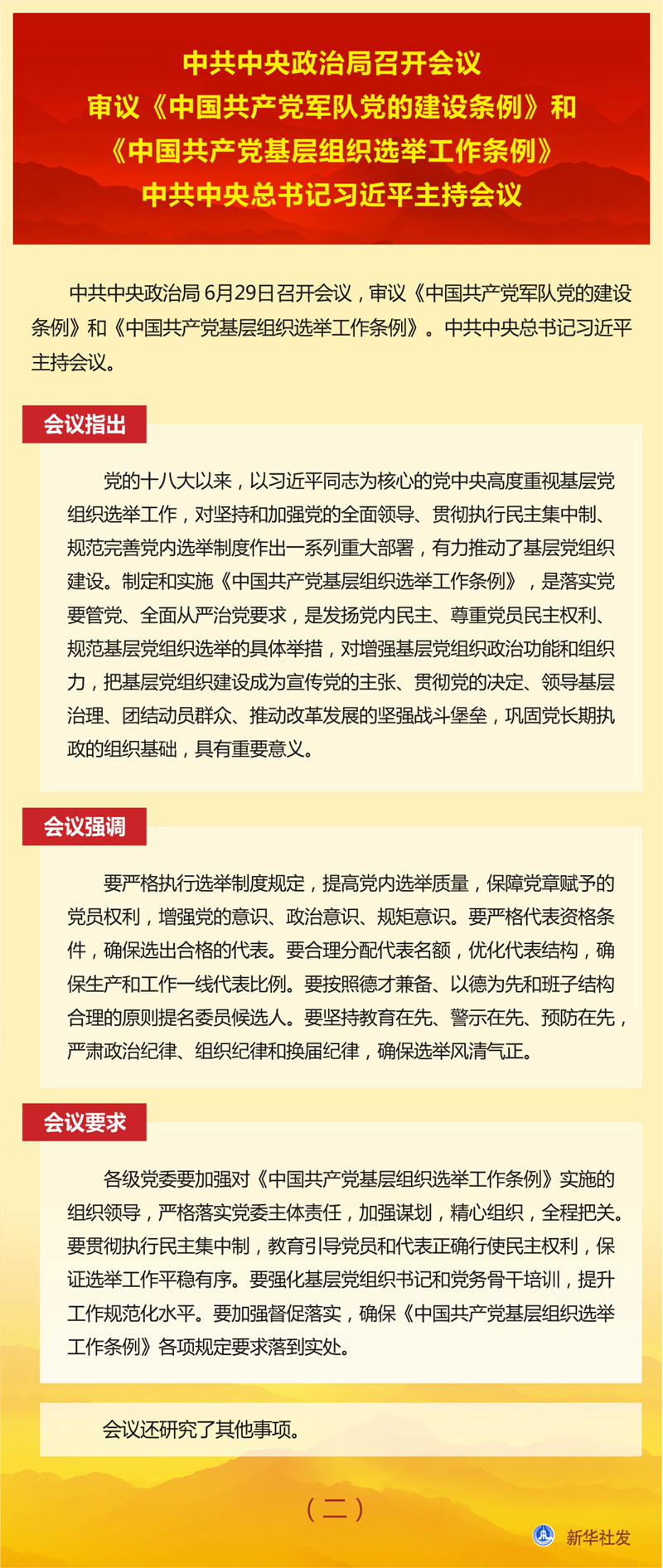 審議《中國(guó)共產(chǎn)黨軍隊(duì)黨的建設(shè)條例》和《中國(guó)共產(chǎn)黨基層組織選舉工作條例》 習(xí)近平主持會(huì)議