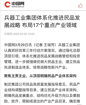 中國(guó)網(wǎng):兵器工業(yè)集團(tuán)體系化推進(jìn)民品發(fā)展戰(zhàn)略 布局17個(gè)重點(diǎn)產(chǎn)業(yè)領(lǐng)域