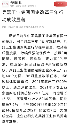 光明日?qǐng)?bào)客戶端:兵器工業(yè)集團(tuán)國(guó)企改革三年行動(dòng)成效顯著