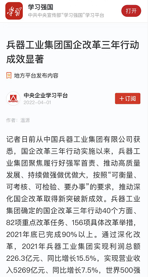 學(xué)習(xí)強(qiáng)國(guó)平臺(tái):兵器工業(yè)集團(tuán)國(guó)企改革三年行動(dòng)成效顯著