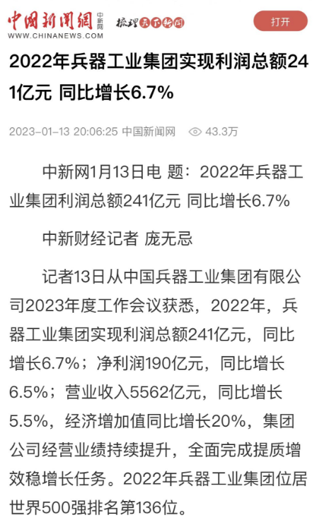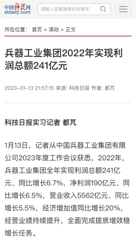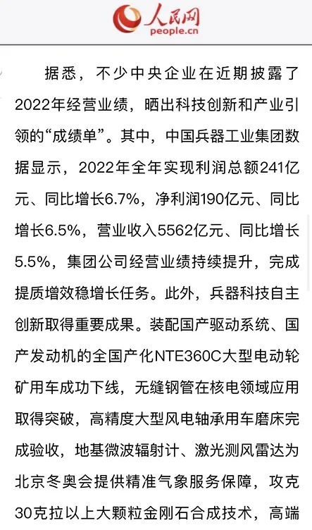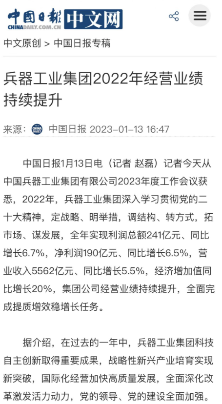 1月13日,中國(guó)兵器工業(yè)集團(tuán)有限公司召開(kāi)2023年度工作會(huì)議,傳達(dá)學(xué)習(xí)中央領(lǐng)導(dǎo)同志、軍方首長(zhǎng)和上級(jí)部門(mén)重要批示,總結(jié)集團(tuán)公司2022年工作,研究部署2023年主要工作任務(wù)。 集團(tuán)公司2022年重點(diǎn)工作取得的成績(jī)及下一步的改革發(fā)展受到社會(huì)媒體廣泛關(guān)注。新華社、新華財(cái)經(jīng)、人民網(wǎng)、經(jīng)濟(jì)日?qǐng)?bào)客戶端、光明日?qǐng)?bào)客戶端、中國(guó)日?qǐng)?bào)網(wǎng)、中國(guó)科技網(wǎng)、中國(guó)新聞網(wǎng)、央廣網(wǎng)、國(guó)資委網(wǎng)站、學(xué)習(xí)強(qiáng)國(guó)中央企業(yè)學(xué)習(xí)平臺(tái)、新浪網(wǎng)、騰訊網(wǎng)、搜狐網(wǎng)、網(wǎng)易網(wǎng)、今日頭條等中央主流媒體、國(guó)家部委網(wǎng)站及知名網(wǎng)絡(luò)媒體對(duì)集團(tuán)公司工作會(huì)議進(jìn)行了報(bào)道,重點(diǎn)關(guān)注集團(tuán)公司高質(zhì)量發(fā)展、科技創(chuàng)新、戰(zhàn)略性新興產(chǎn)業(yè)培育、深化改革、國(guó)際化經(jīng)營(yíng)、履行央企社會(huì)責(zé)任等內(nèi)容。其中新華社以《北斗時(shí)空智能服務(wù)平臺(tái)累計(jì)服務(wù)終端數(shù)突破15億》為題,重點(diǎn)報(bào)道了集團(tuán)公司2022年在自主創(chuàng)新、戰(zhàn)略新興產(chǎn)業(yè)培育、專利申請(qǐng)等方面取得的成績(jī);經(jīng)濟(jì)日?qǐng)?bào)客戶端、光明日?qǐng)?bào)客戶端、中國(guó)日?qǐng)?bào)網(wǎng)等以《兵器工業(yè)集團(tuán)2022年經(jīng)營(yíng)業(yè)績(jī)持續(xù)提升》為題,重點(diǎn)報(bào)道了集團(tuán)公司在高質(zhì)量發(fā)展、全面完成提質(zhì)增效穩(wěn)增長(zhǎng)方面取得的成績(jī)。集團(tuán)公司門(mén)戶網(wǎng)站、微信公眾號(hào)、微博等新媒體也對(duì)集團(tuán)公司工作會(huì)議進(jìn)行了及時(shí)報(bào)道,各成員單位紛紛對(duì)相關(guān)內(nèi)容進(jìn)行轉(zhuǎn)載,引發(fā)全系統(tǒng)關(guān)注。 新華社:北斗時(shí)空智能服務(wù)平臺(tái)累計(jì)服務(wù)終端數(shù)突破15億 新華財(cái)經(jīng):兵器工業(yè)集團(tuán)2022年實(shí)現(xiàn)凈利潤(rùn)190億元 同比增長(zhǎng)6.5% 人民網(wǎng):2022年中央企業(yè)營(yíng)收同比增長(zhǎng)8.3% 科技創(chuàng)新成效顯著 經(jīng)濟(jì)日?qǐng)?bào)客戶端:兵器工業(yè)集團(tuán)2022年經(jīng)營(yíng)業(yè)績(jī)持續(xù)提升 光明日?qǐng)?bào)客戶端:兵器工業(yè)集團(tuán)2022年經(jīng)營(yíng)業(yè)績(jī)持續(xù)提升 中國(guó)日?qǐng)?bào)網(wǎng):兵器工業(yè)集團(tuán)2022年經(jīng)營(yíng)業(yè)績(jī)持續(xù)提升 中國(guó)科技網(wǎng):兵器工業(yè)集團(tuán)2022年實(shí)現(xiàn)利潤(rùn)總額241億元 中國(guó)新聞網(wǎng):2022年兵器工業(yè)集團(tuán)實(shí)現(xiàn)利潤(rùn)總額241億元 同比增長(zhǎng)6.7% 國(guó)資委網(wǎng)站:2022年兵器工業(yè)集團(tuán)實(shí)現(xiàn)利潤(rùn)總額241億元 同比增長(zhǎng)6.7% 學(xué)習(xí)強(qiáng)國(guó)中央企業(yè)學(xué)習(xí)平臺(tái):兵器工業(yè)集團(tuán)2022年經(jīng)營(yíng)業(yè)績(jī)持續(xù)提升 集團(tuán)公司職工及廣大網(wǎng)友熱議工作會(huì)議 “這次會(huì)議全面總結(jié)了2022年工作,深入分析研判當(dāng)前形勢(shì),部署2023年重點(diǎn)工作,為我們做好2023年及今后一個(gè)時(shí)期的工作明確了目標(biāo)、堅(jiān)定了信心?!?/p> “作為兵工人,我要苦練內(nèi)功、不懼挑戰(zhàn)、奮勇向前,為建設(shè)具有全球競(jìng)爭(zhēng)力的世界一流集團(tuán)公司貢獻(xiàn)自己的力量?!?/p> “聚焦高科技領(lǐng)域,制造更多的大國(guó)重器,讓更多的產(chǎn)品服務(wù)老百姓。” “在不平凡的2022年取得了亮眼的工作成績(jī),為兵器工業(yè)點(diǎn)贊?!?/p> “希望能有更多新型武器裝備部隊(duì),2023年,望你們?cè)賱?chuàng)輝煌,加油!” |