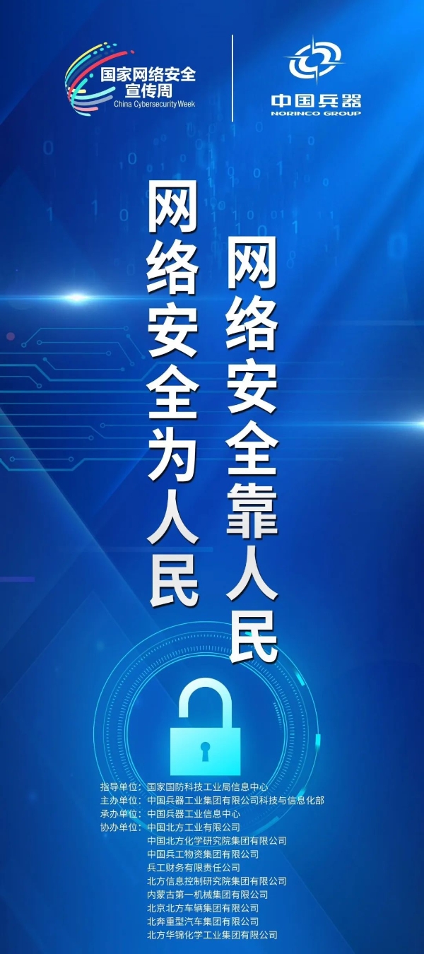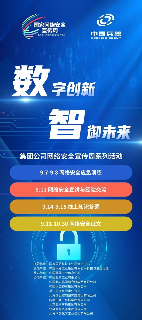9月11日至17日,中國兵器工業(yè)集團有限公司以“數(shù)字創(chuàng)新 智御未來”為主題,圍繞集團公司“1+5”戰(zhàn)略和“雙十”規(guī)劃,組織開展集團公司網(wǎng)絡(luò)安全宣傳周系列活動。
